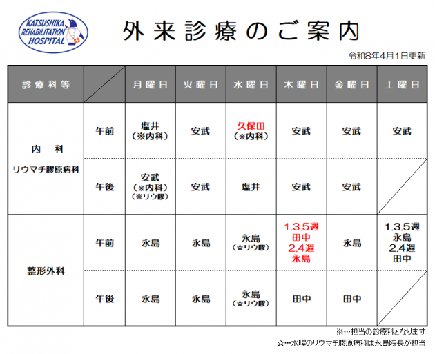 4月1日(水)より内科・整形外科担当医に変更があります。